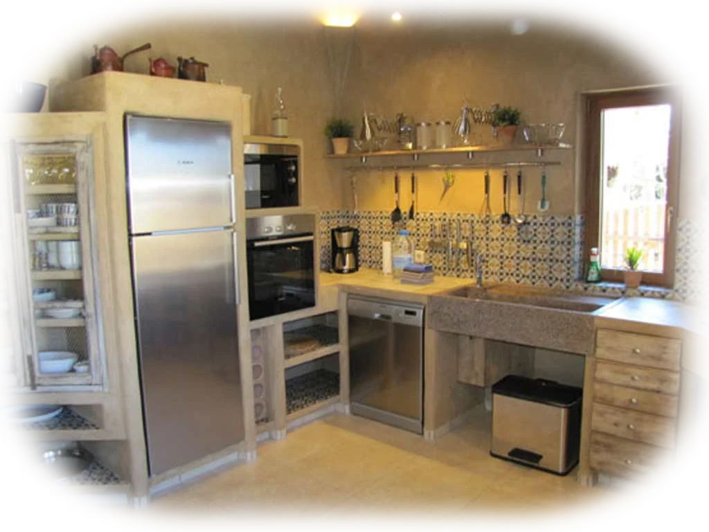 - eine vollausgestattete, rustikale Küche mit ausziehbarem Esstisch.